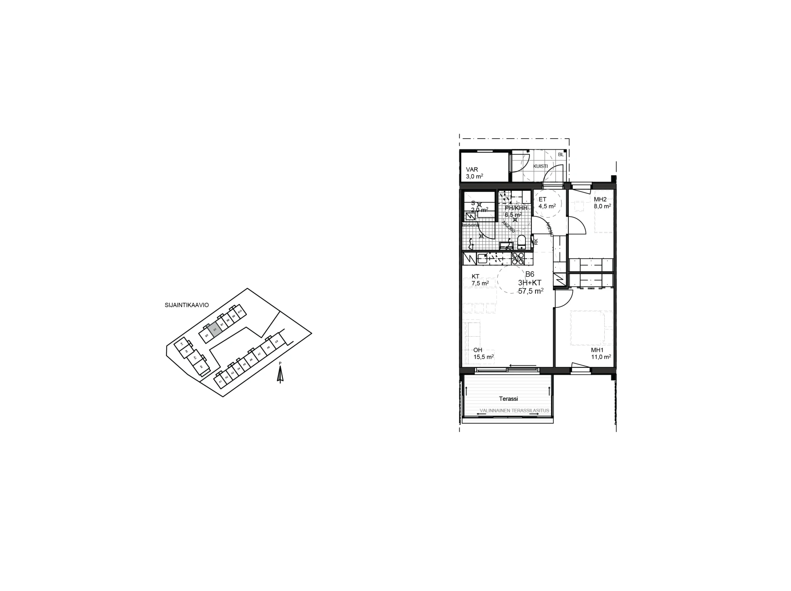 Rivitalo| Pinta-ala 57,5 m² | 3 h + kt + s
